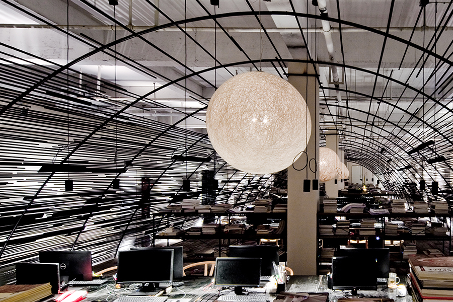 推开厚重朴实的玻璃门,我们走进的是光于影的世界,干枯的细竹在这里得到了充分的利用。设计室摈弃了古板老套的天花隔板,而是把大自然的“四君子”之一请进了办公室,我们闻到的不是刺鼻的油漆味,而是清新纯净的自然气息,灯光的灵魂在竹子的格调下也变得分外灵动,好像灯光也有了生命!走进叙品,心就从此落定了,也被这里深深地磁场吸住了,工作不再是索然无味,而是一种沉浸其中的自然之乐!本空间即叙品人平时工作的“潘多拉之地”———设计的原创动力屋。
