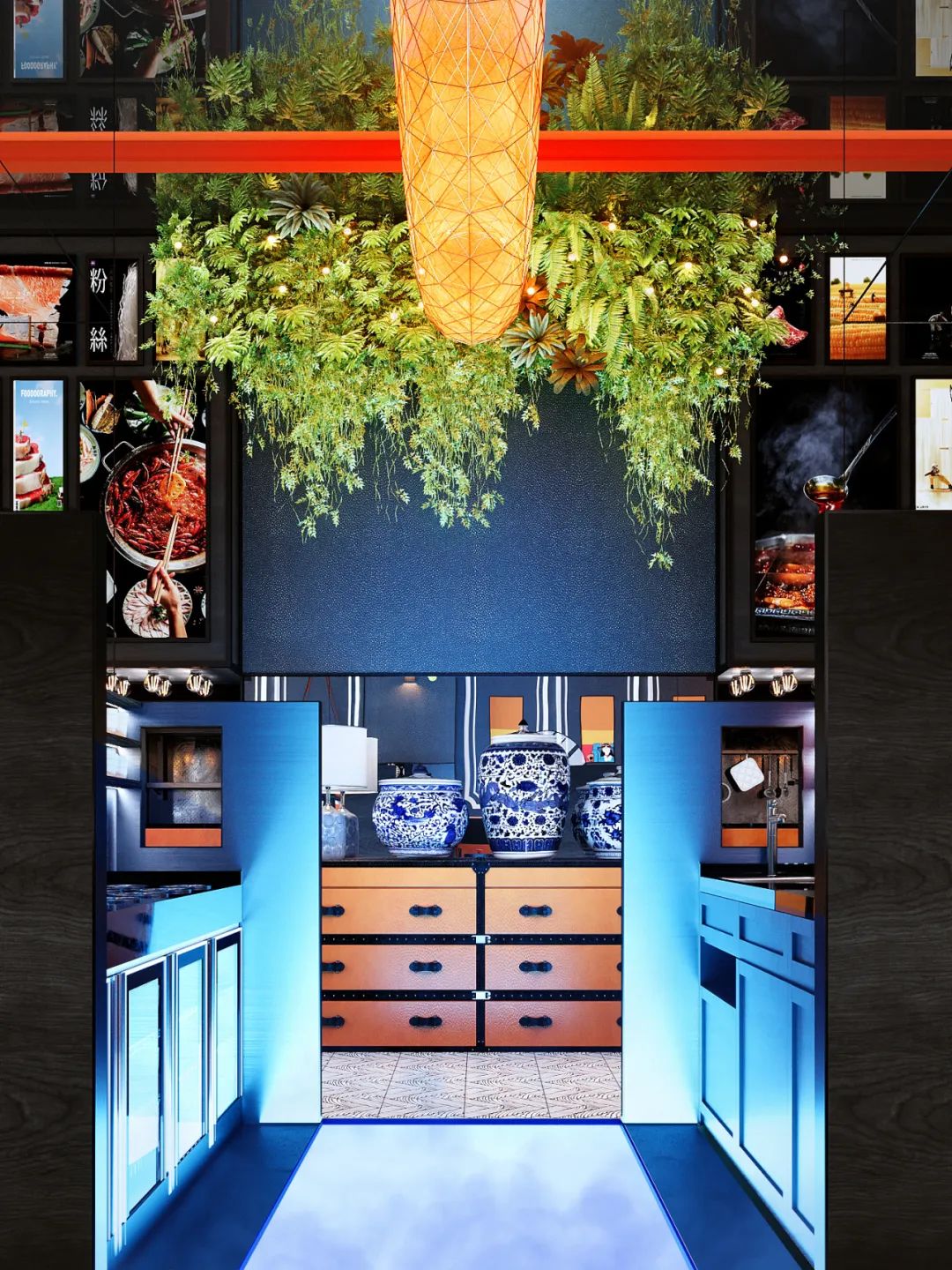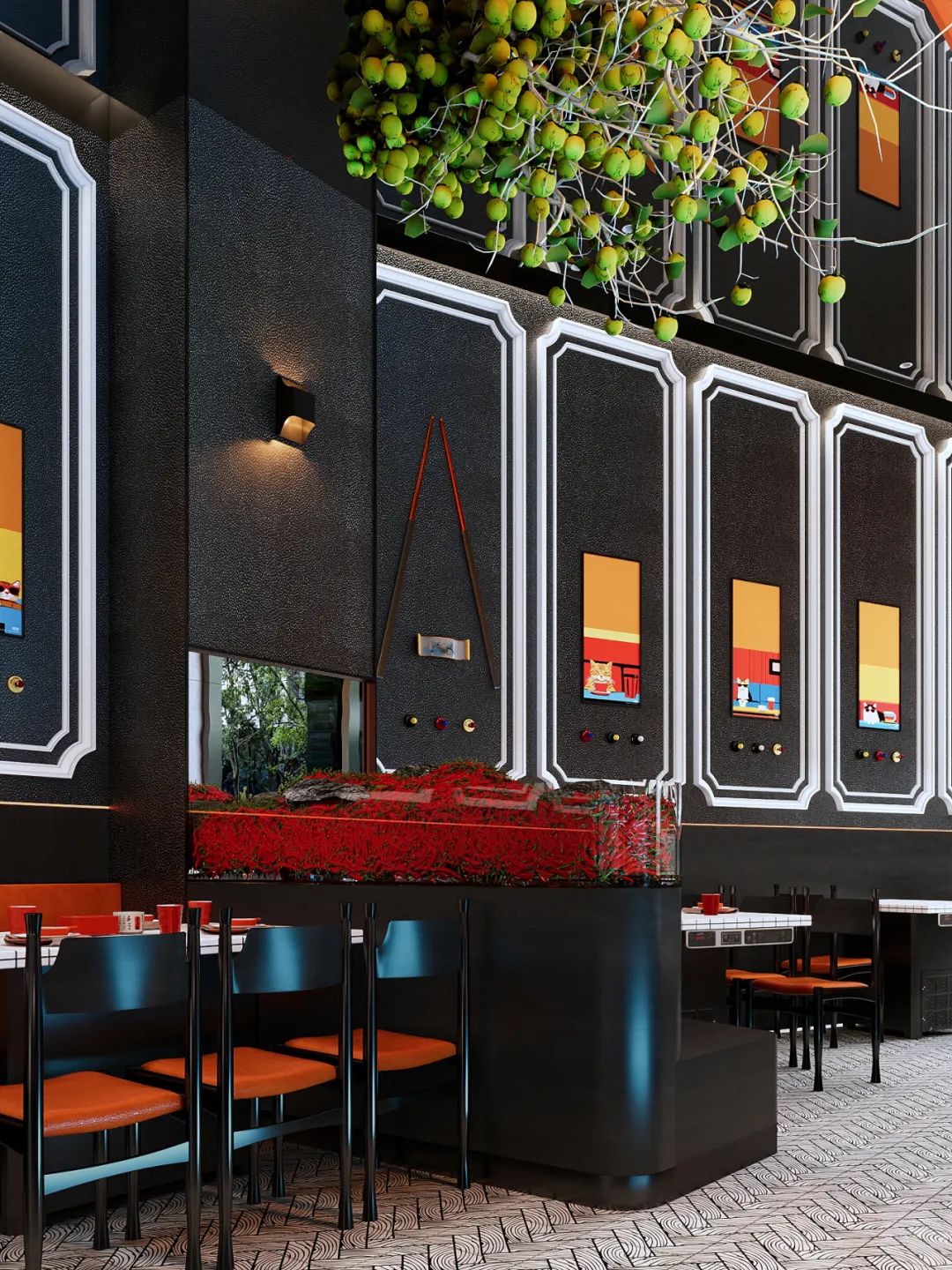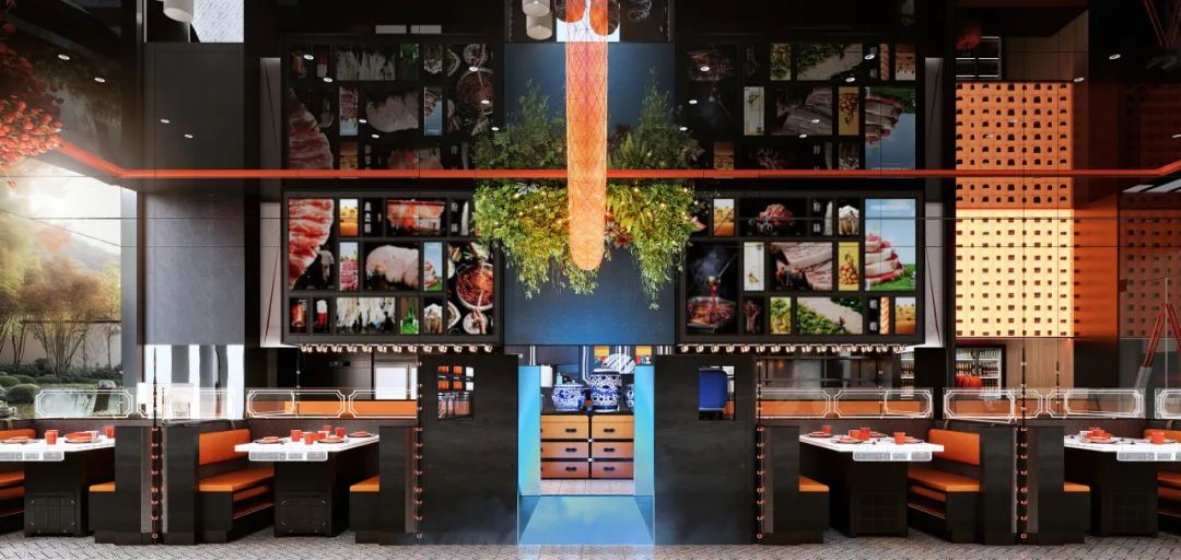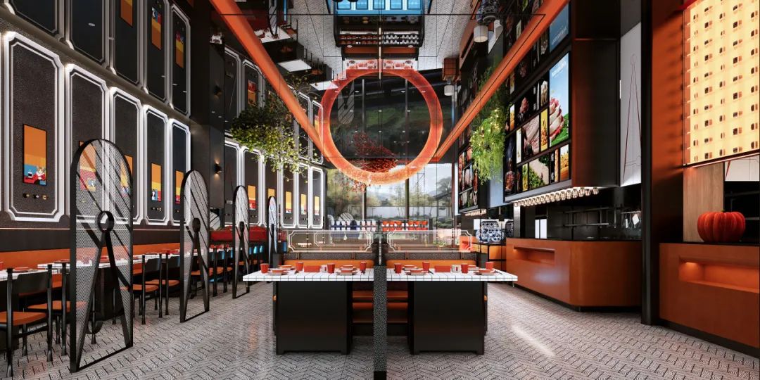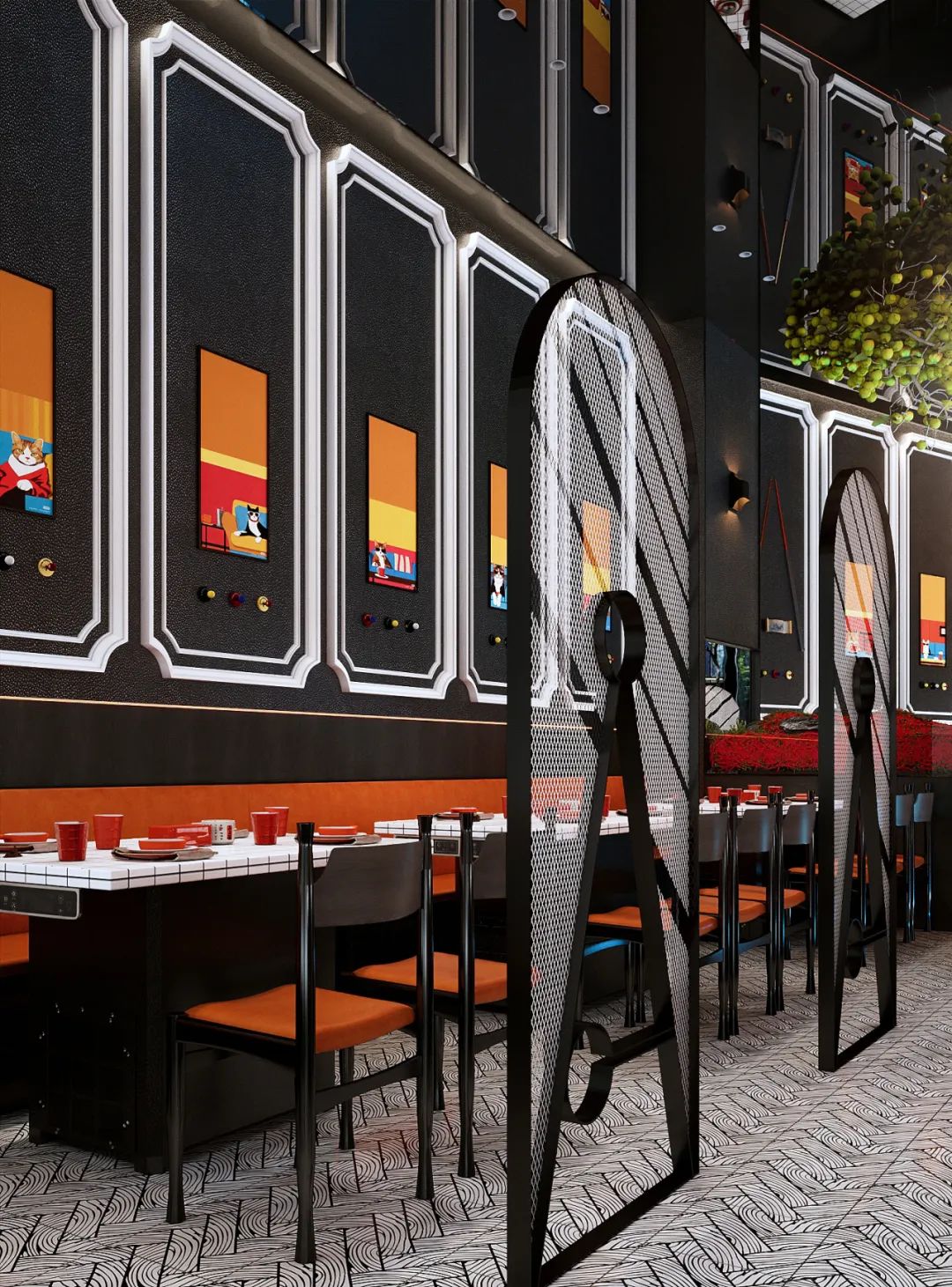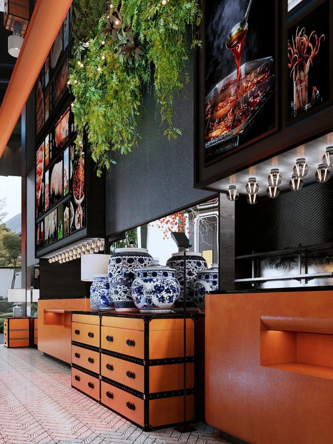 空间通过主材不锈钢与珍珠皮革的结合构建一个兼具克制与爆发力的沉浸式火锅体验场域。橙色艺术装置灯搭配局部橙色线性光带,模拟火锅沸腾时的光影跃动,激发食欲与社交欲。