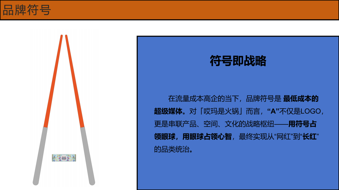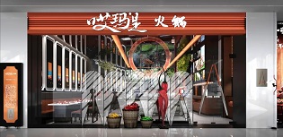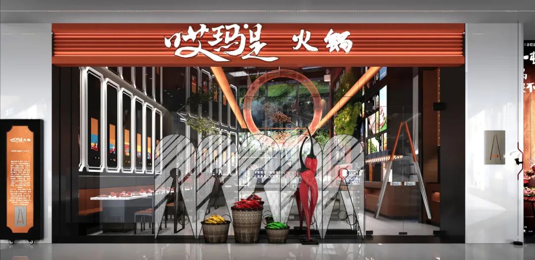 以 黑白极简为基底,诠释现代火锅的摩登气质,橙色作为点睛之笔贯穿在最显眼的区域。 ”A”作为形象logo被运用在门把手处,这将作为品牌符号一直沿用到以后每家门店。