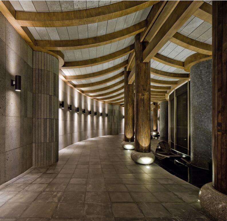 踱步于连廊,墙面的藤编壁纸、天花上的木格栅,梦幻光影,一条古船安静停泊,好一幅诗意的画面。