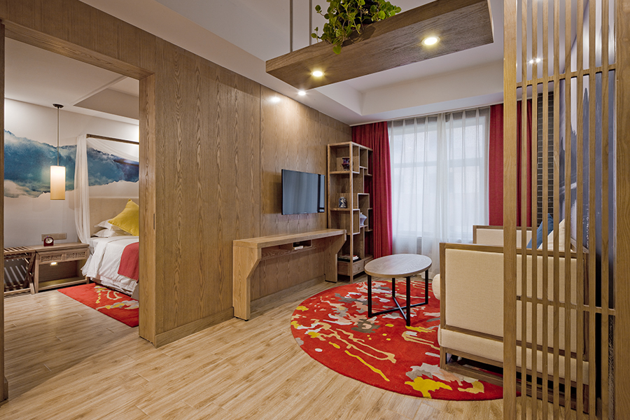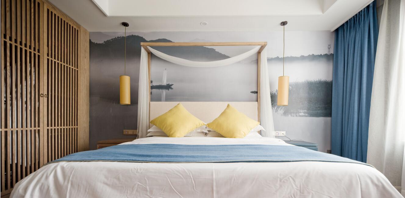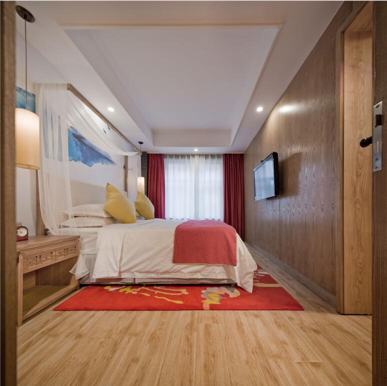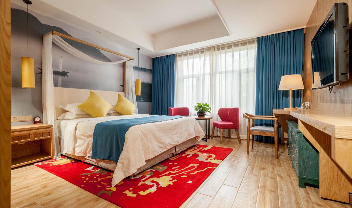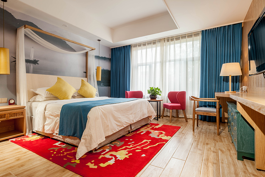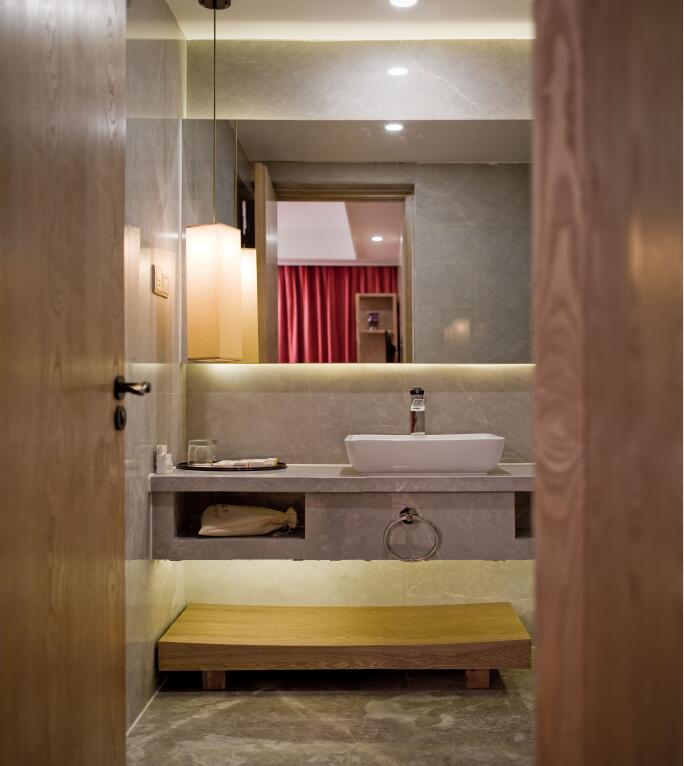 穿过悠长的过道,推门而入,扑面而来的亲切感。房间在整体设计上简洁而时尚,明快的色彩与柔和的灯光相互呼应,营造出温馨如家的舒适氛围。
