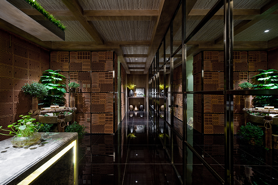 入门的四周墙面都是红色的小砖,瓦片错叠拼接,中间用黑色的拉丝不锈钢线条分割,精致又有点古老的味道。地面是黑色的光面砖,像是一片黑色的海洋,倒映着暗红色的墙面,空间显得干净温暖。