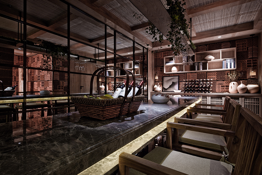 - 主要材料:红砖红瓦,水泥板,爵士白大理石,原木色实木板,藤编壁纸