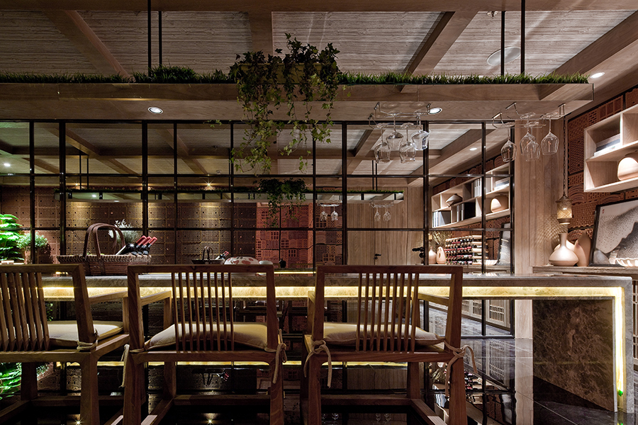 吧台后面用镜子和黑色不锈钢条做成宽窄不一的格子,跟红色的砖墙形式一样,用镜子拓展不宽敞的空间,使空间显得更有深度。