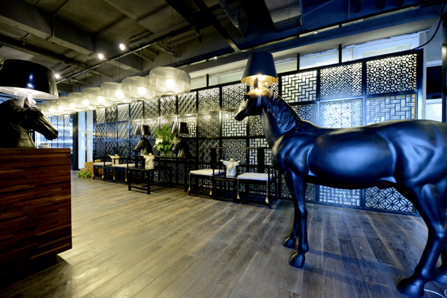 - 主要材料:黑色方钢、中式镂空木格等
