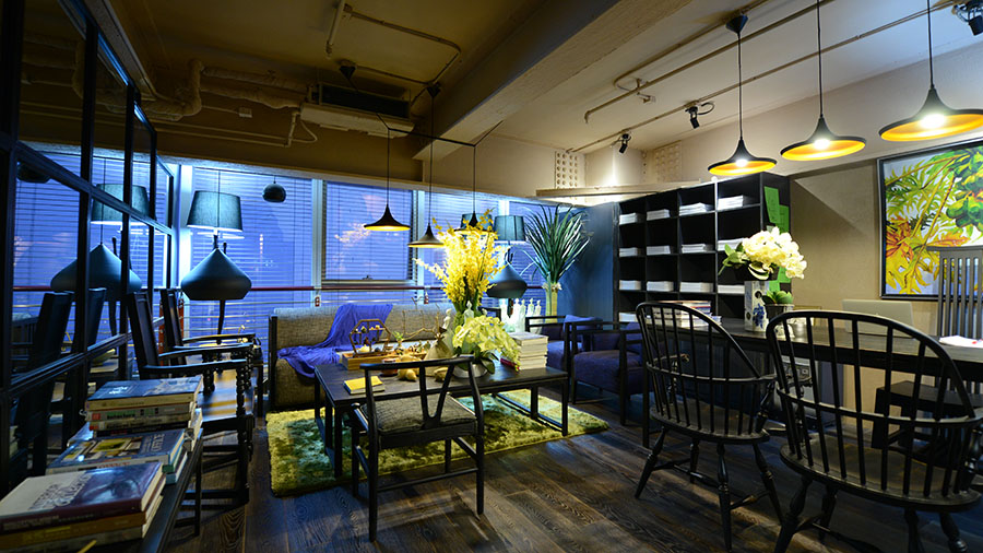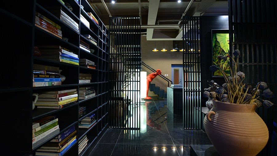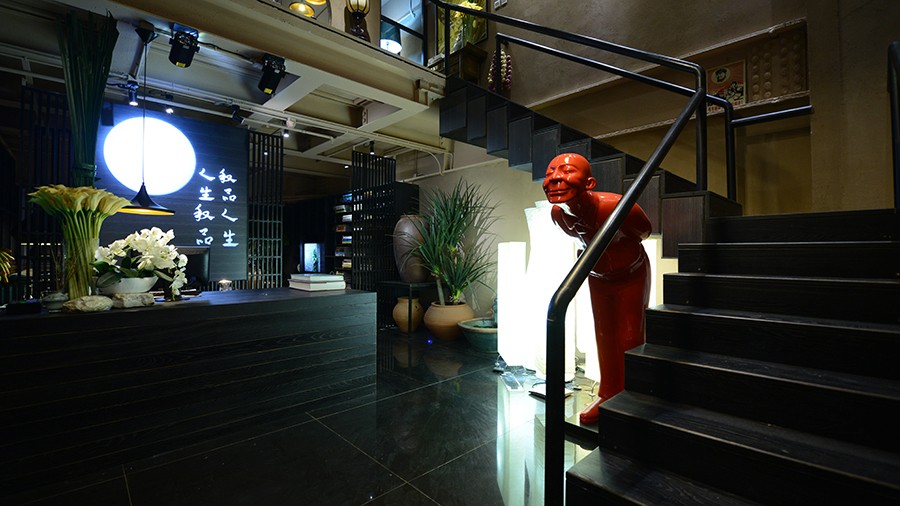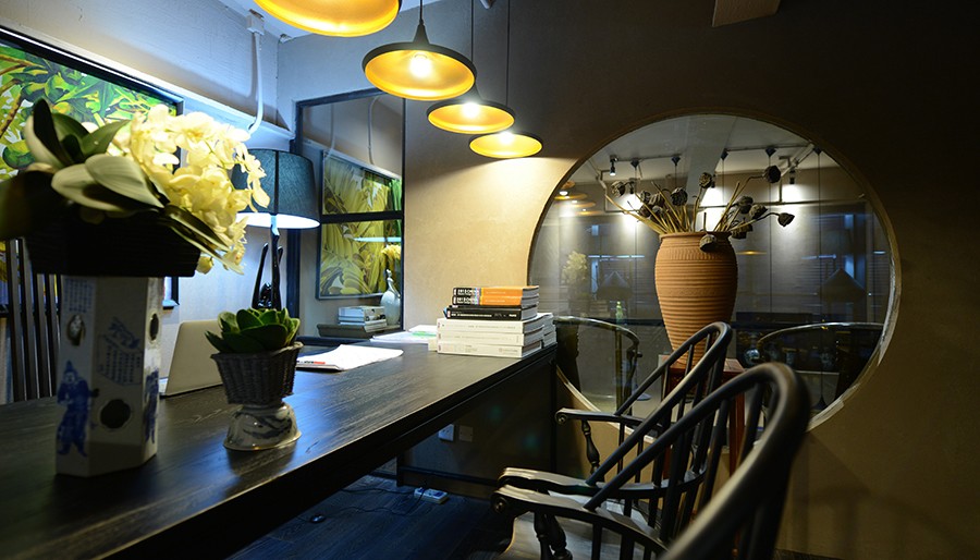 二楼主要创造了一个镜像空间。镜子和铁丝网材质的给人特别的感受,将镜子反射的特点运用在隔断上,使本来很小的空间看的更加的宽广,更有意境。二楼集合了设计师办公、会议、会客这些功能。会客酒吧区既可以一边品酒喝茶又营造了舒适的交谈氛围。从楼梯上去,两把中式圈椅摆在过道边上,立马让人产生一种东方禅意的韵味。设计师办公室的圆窗的设计,主要借鉴了园林的透景的设计手法。