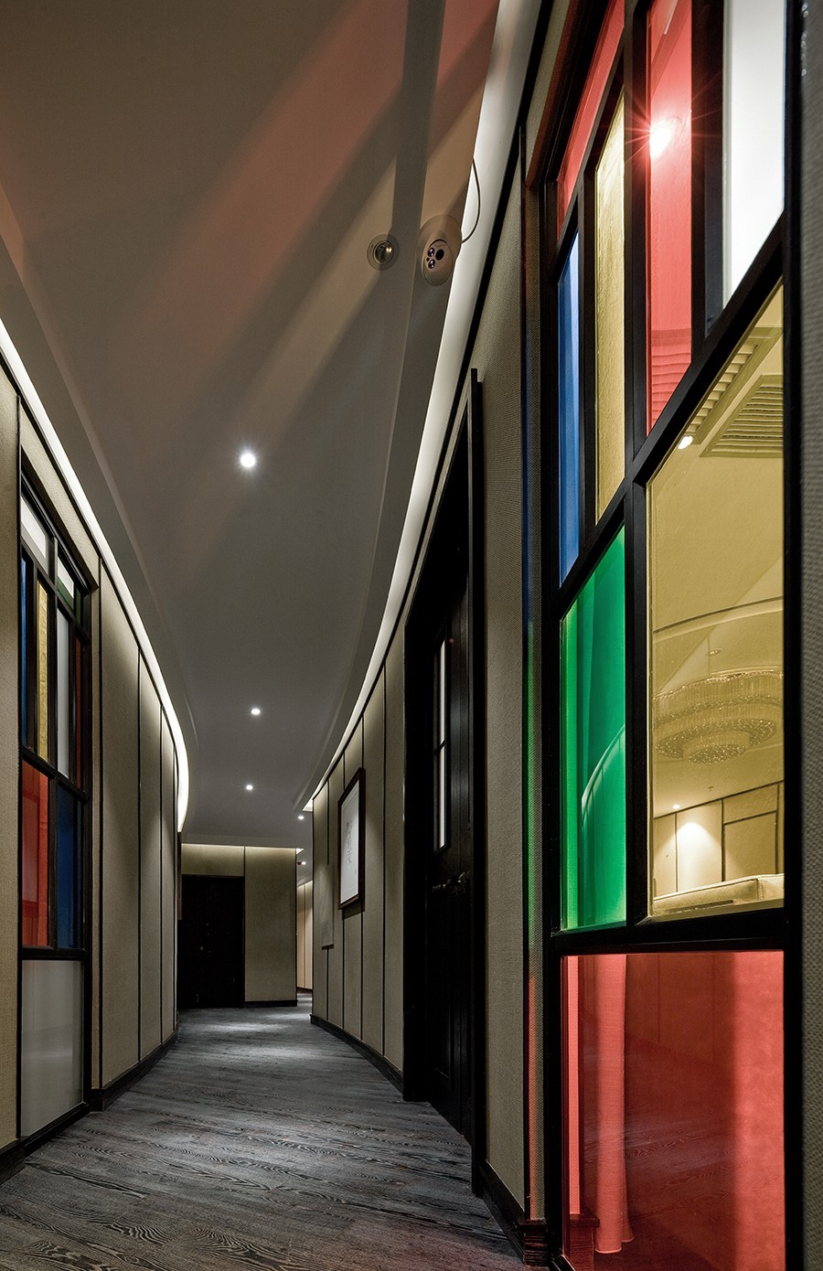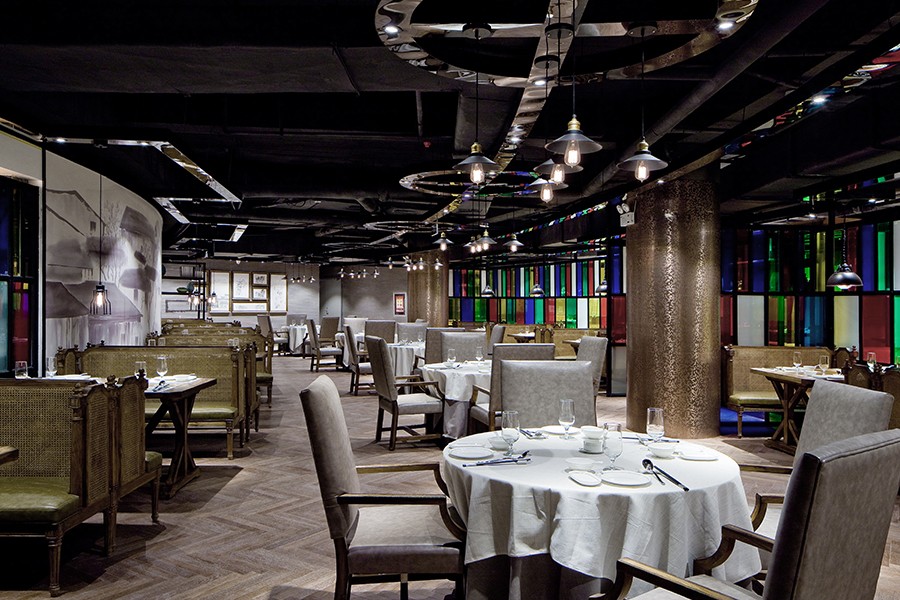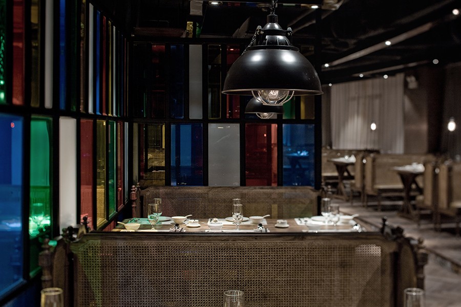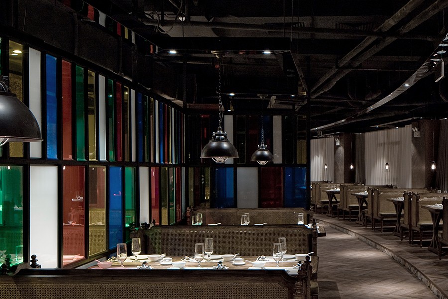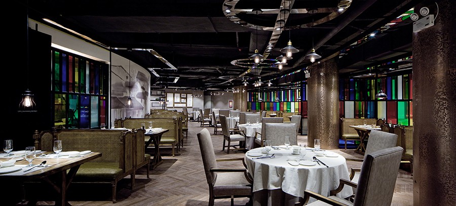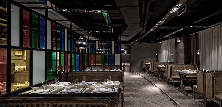 彩色的玻璃、桌椅给素色的空间增加了许多色彩,也增加了用餐氛围,给人一种热闹沸腾的场面。原顶保留了原有空间的高度,裸露的管道更增添了空间的悠久历史。地面的桌椅在灯光的照射下反射到顶面镜面不锈钢的桥架上,形成一种倒置的感觉。