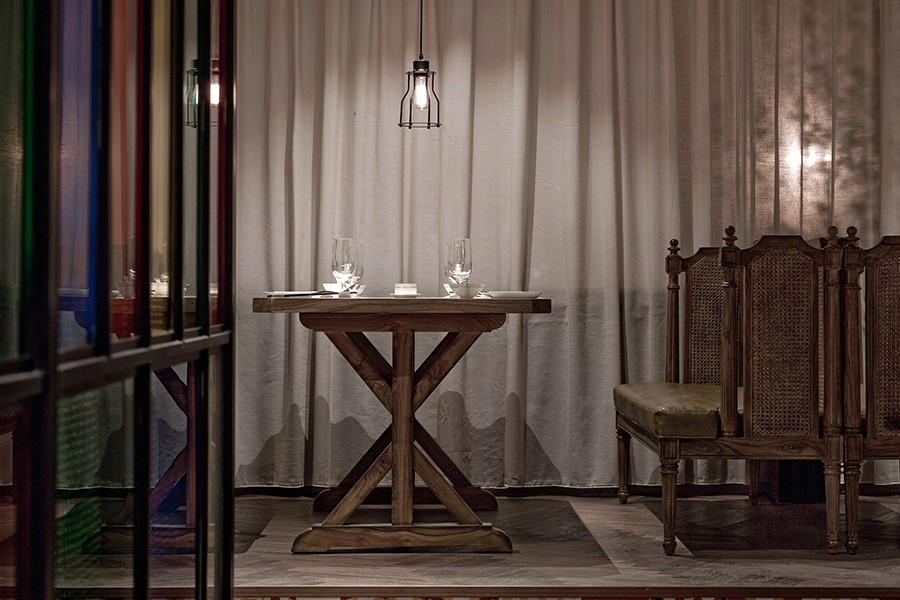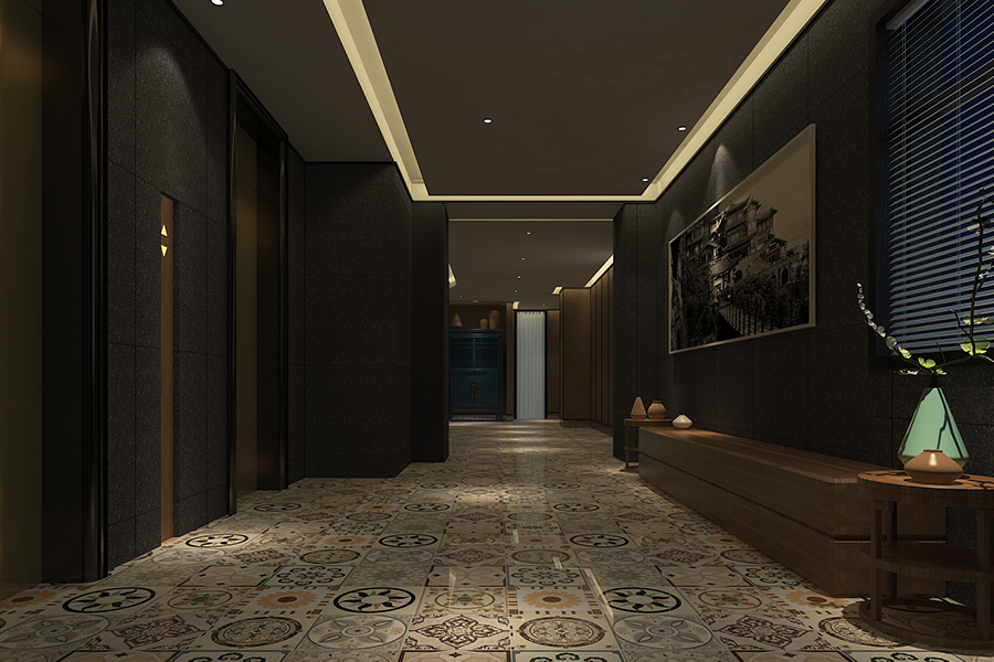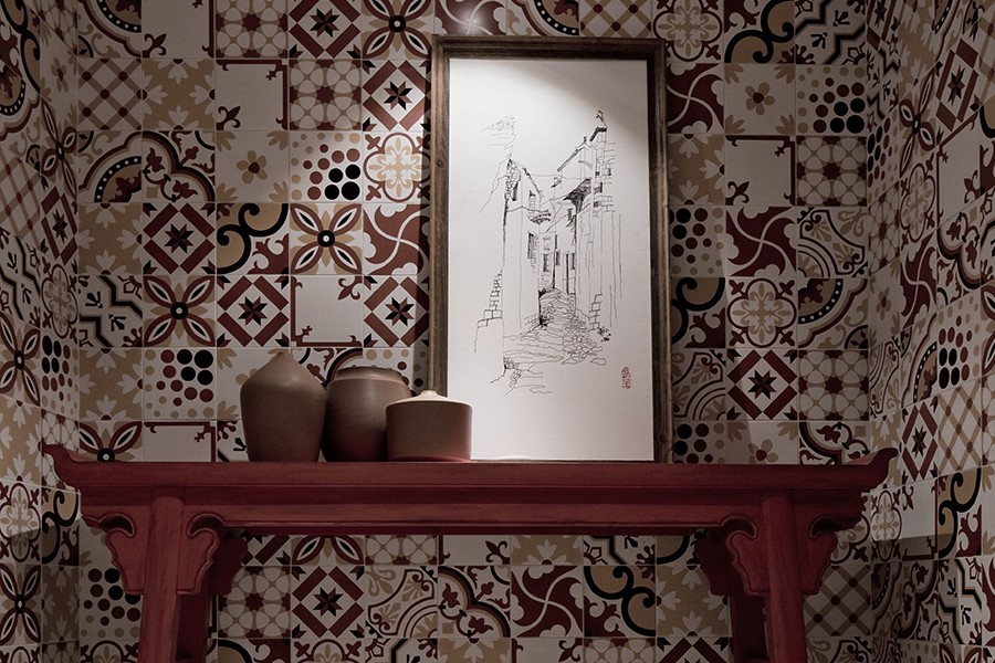 - 主要材料:爵士白大理石、锈铁板、藤编壁纸、彩色玻璃、拼花地砖等