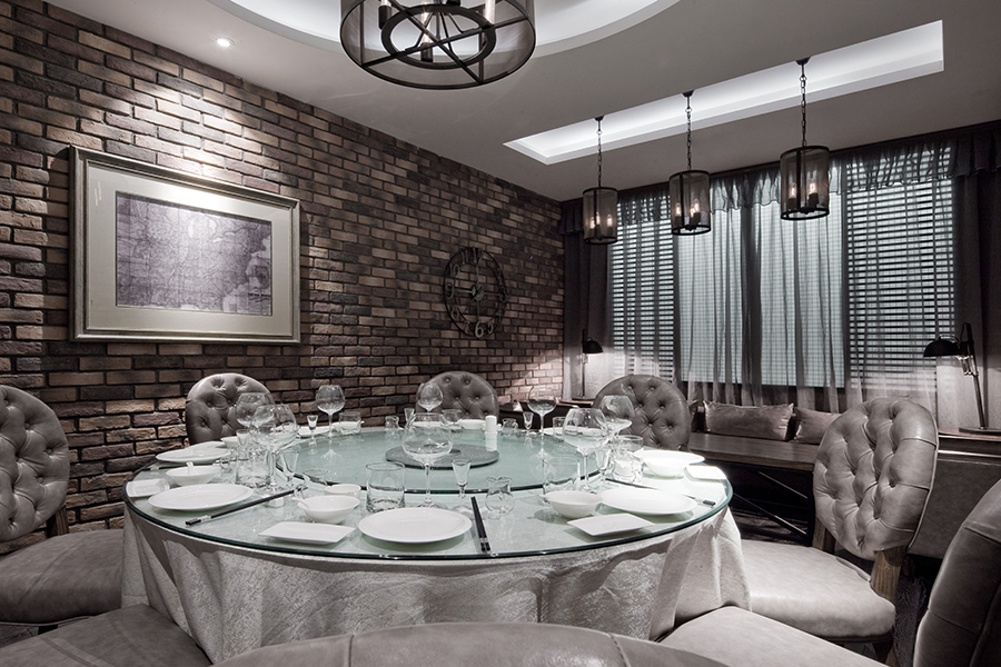 包间没有复杂的造型,复古条砖搭配铁艺的灯具,木本色的家具,流露着一种朴质、自然的情感。