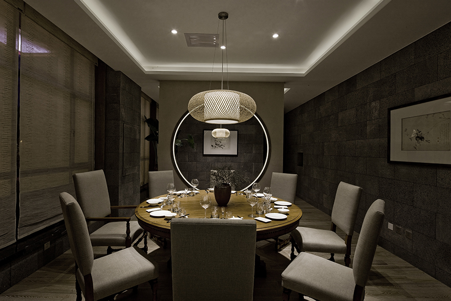 进入前厅是水泥块整齐堆砌的背景墙,穿过铁锈板的移门,便是大厅。锈铁板雕刻的不规则“水云间”字体悬挂于火山岩墙面上。墙面的柜子被分成了大大小小的框架,每一个框架又被等分了许多小格子,很像古代药房的小柜子。内凹的小格子摆满了各种各样的小陶罐,在淡黄色的灯光下愈发显得精致。