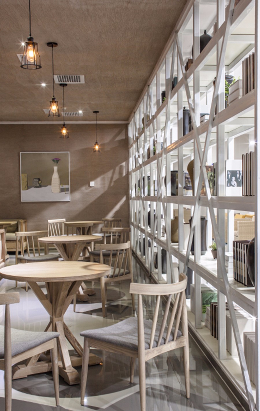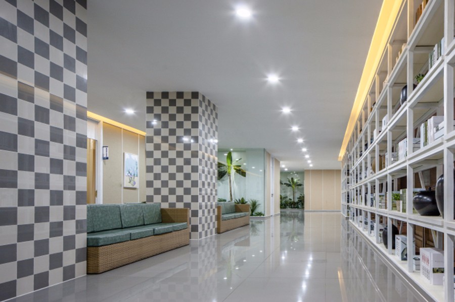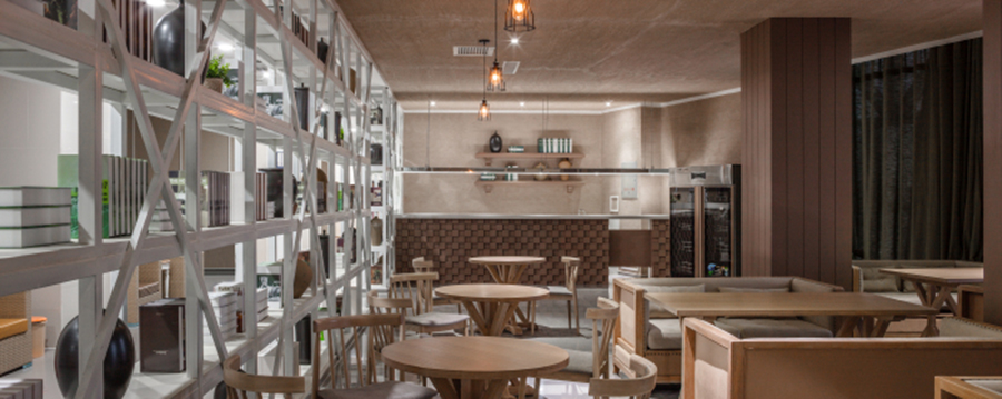 设计师在每一层还专门设计了一个餐吧区,人性化的服务提升了整个空间的品质。白色的层板架上摆放着大小不一的陶罐,还有各种各样的书籍。在这里你可以慢慢的享受用餐,也可以悠闲的翻着着书籍,时间就这样在不知不觉中过去了,也不会觉得无聊。