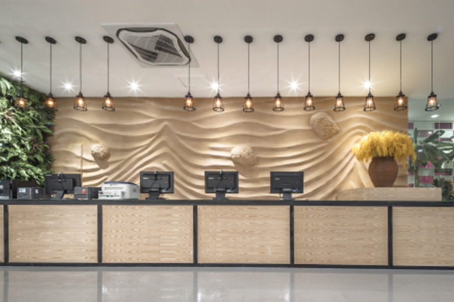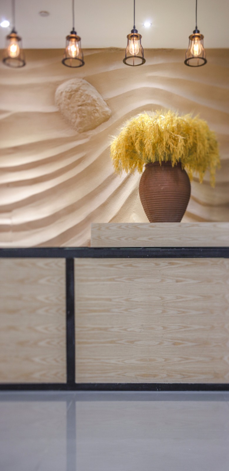 前厅运用了沙漠、草原、绿植等元素为背影,使人一进入大厅便能感受到一种空旷、寂静的回归之美。服务台摈弃了常规大理石的做法,以黑色方管和木头相结合,质朴中透露着亲切的感觉,不再是那么冷冰冰。