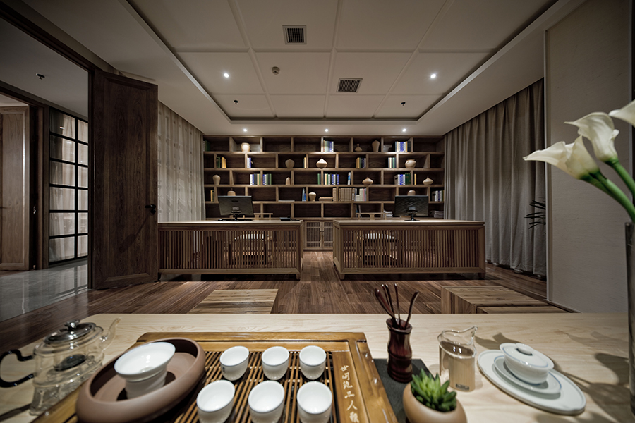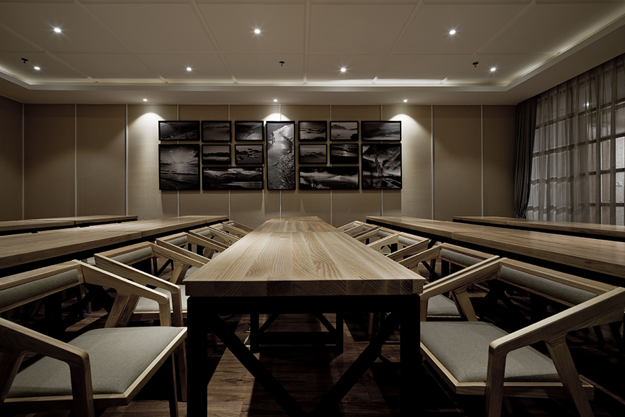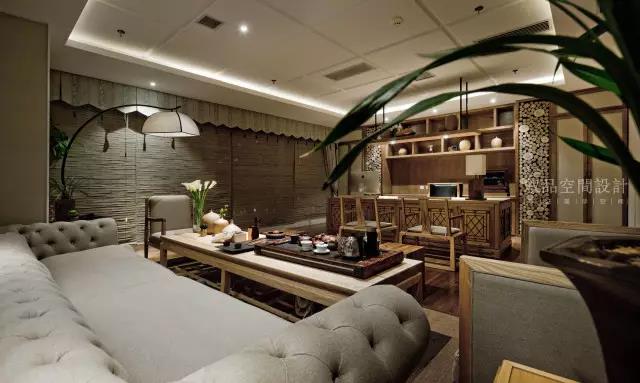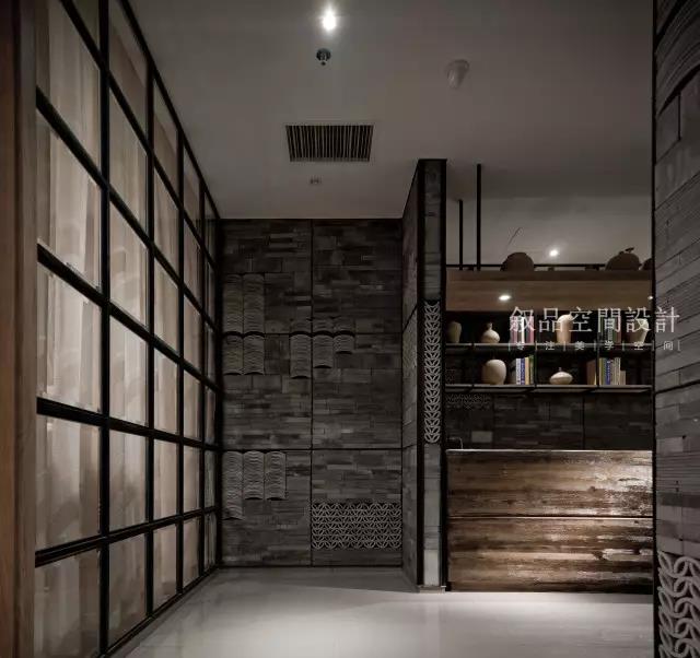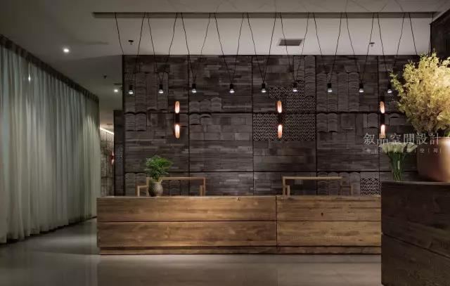 本案入门可见原木色粗狂的饰面接待台,原木质地粗糙,凸显个性。背面黑色木作线条,整洁有序的排列将自然而古朴的粗狂瓦片围合,石材的冰冷加上原木的柔和,纹路细腻与粗野的搭配,刚与柔的结合,狂野中带着柔美。角落摆置着柠檬黄色的跳舞兰,无形中增添一分活力。