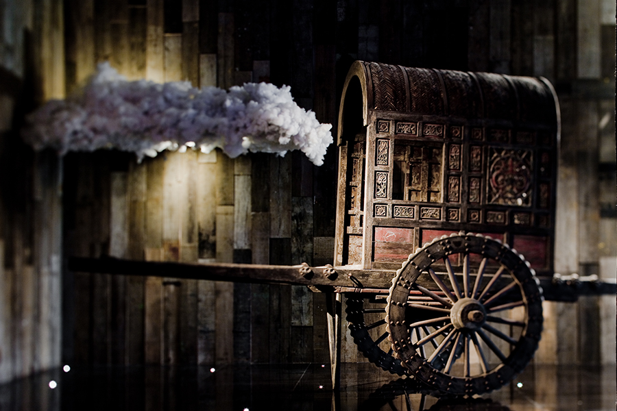 - 主要材料:黑色亮光面地砖、瓦片、旧木板、干细竹,黑色金属管等