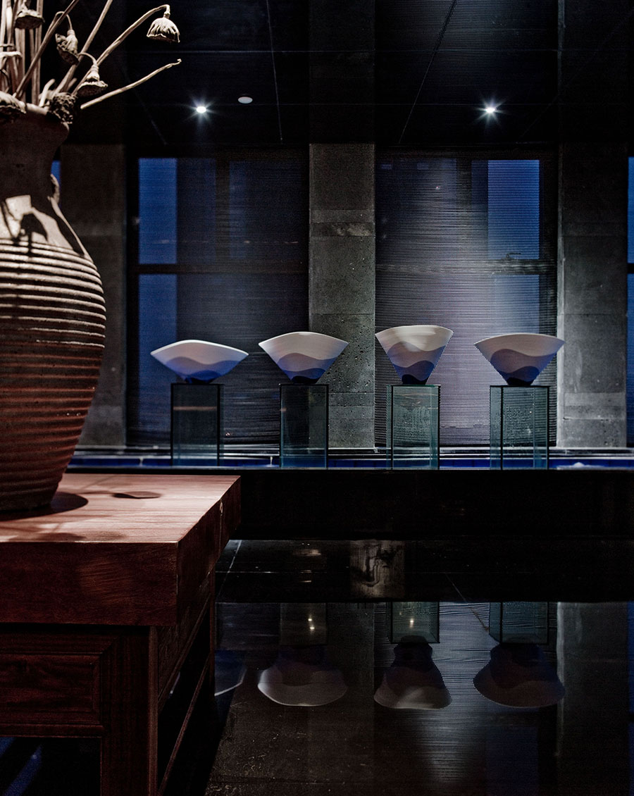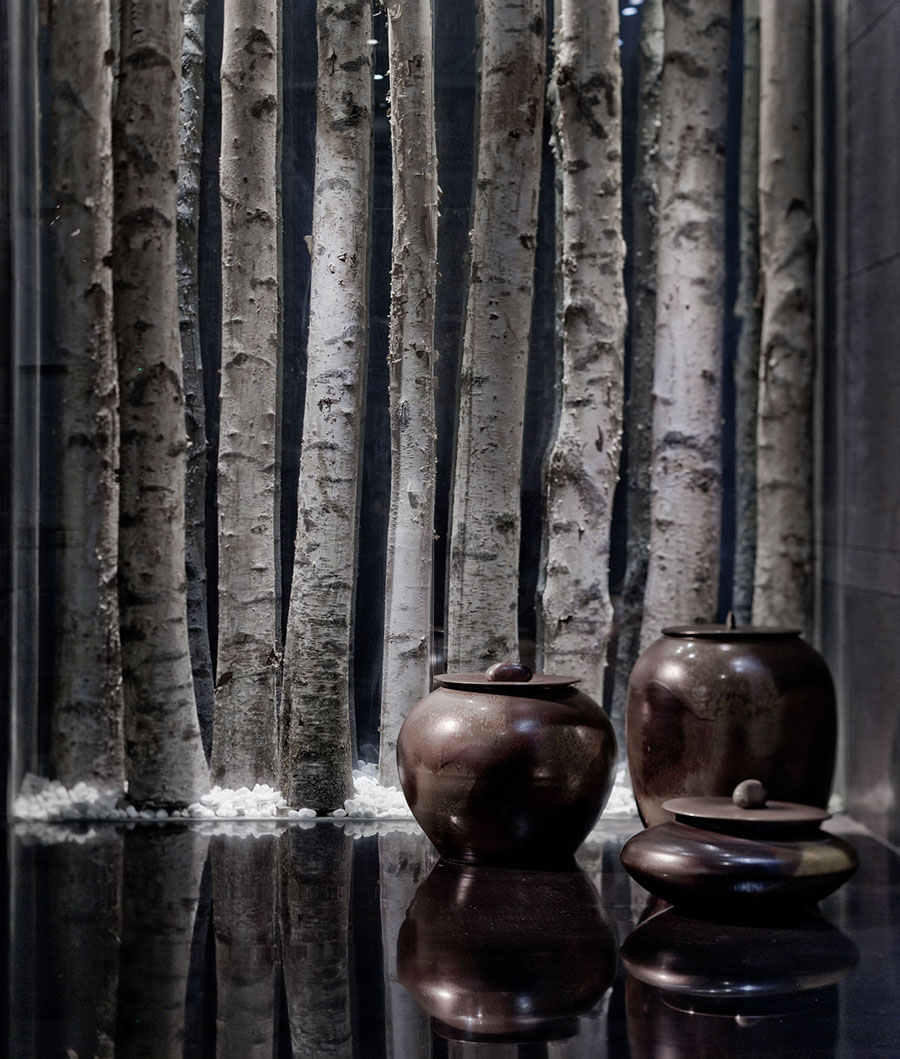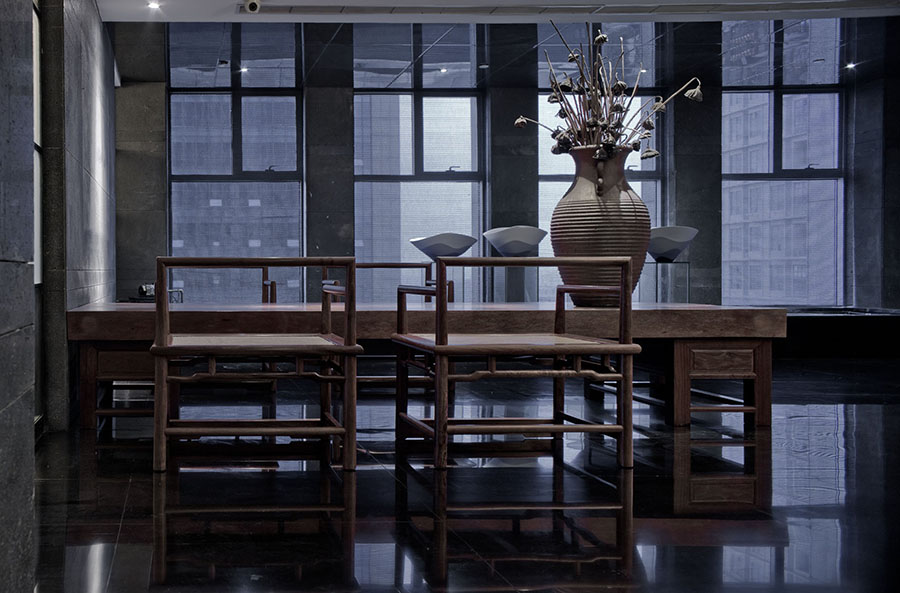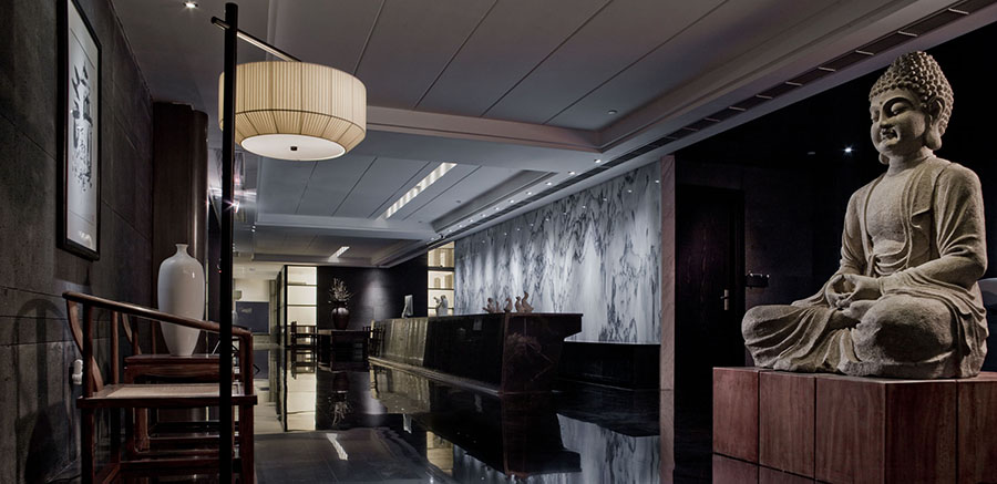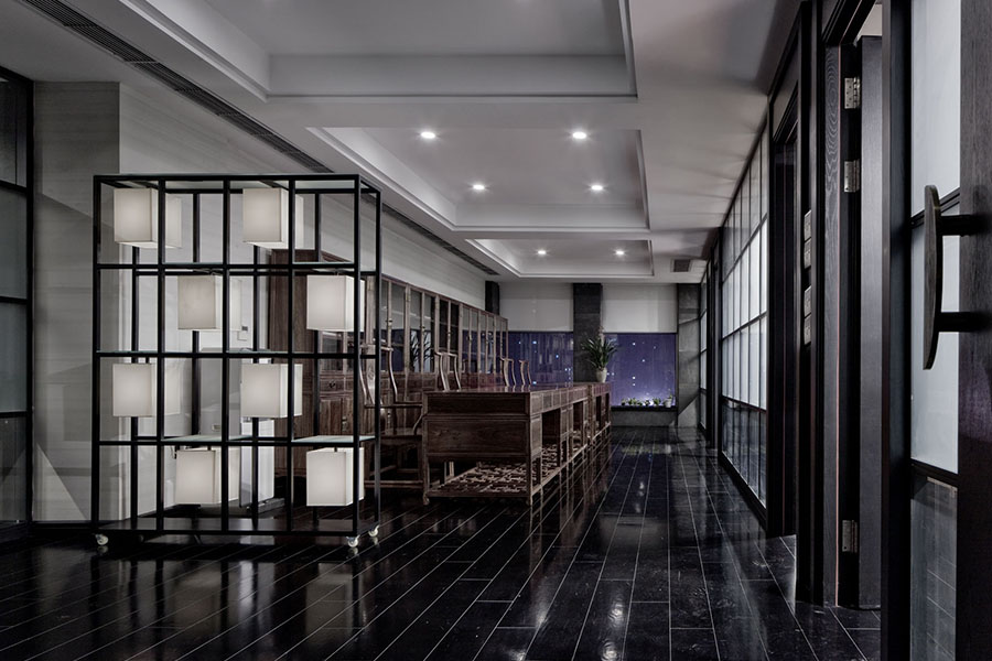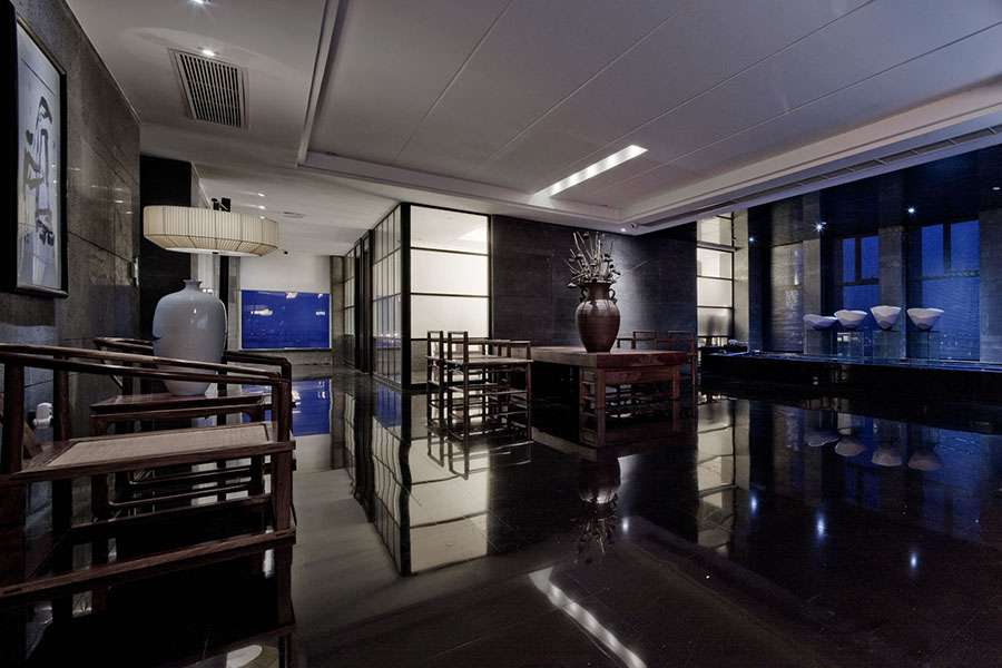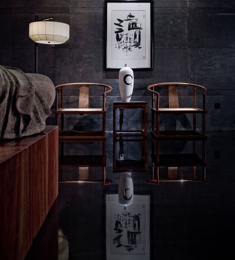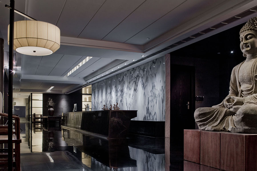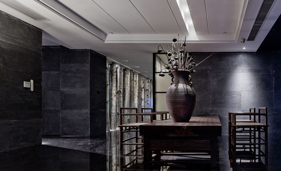 大厅的前台背景是特地在石材产地挑选的,它如墨如画淡雅出尘,妙在似与不似之间再配以侧边的水景以及内敛、质朴的中式家具,让人觉得别有一番韵味,使人产生丰富的遐想无形中透露出中国式的意境之美。