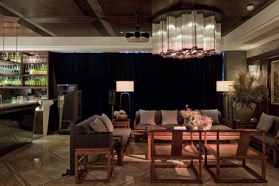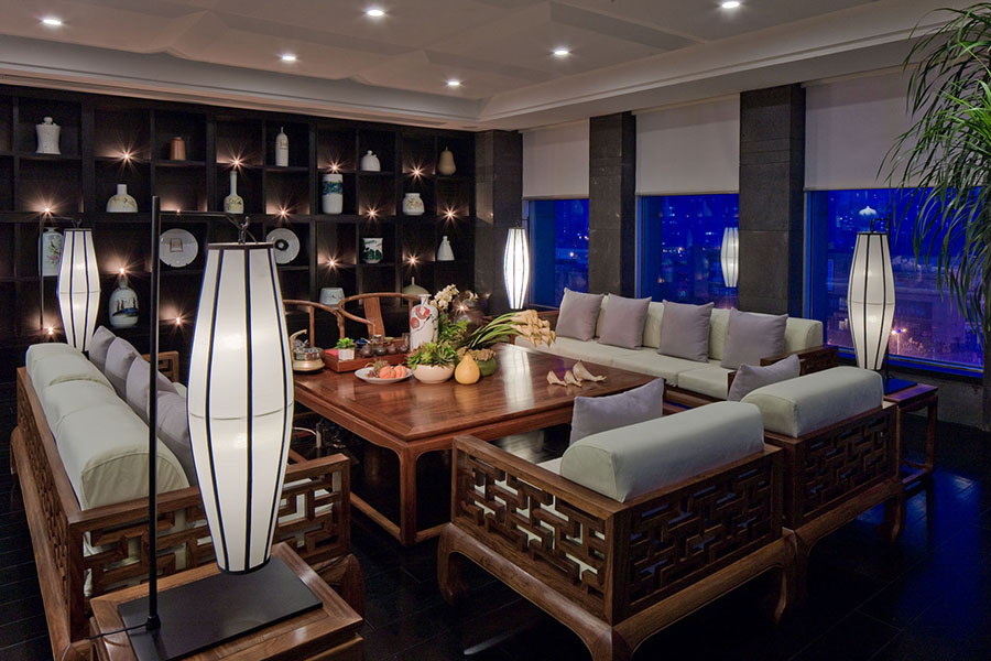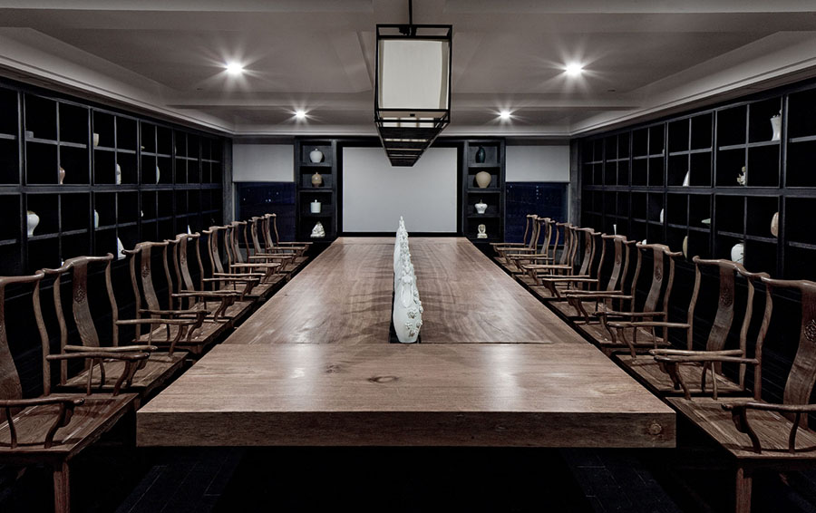 办公室内部运用大面积的书架满载富含知识的书籍和摆放瓷器的饰品架、东方主题的艺术陈设,这些书香气息陶冶的情操无声诉说着办公室主人高品质的文化素养,而顶部设计师则用简练的矩形浮面来体现,整体充斥着立体感与灯光的碰撞让你感到视觉上的冲击,在这宁静安逸的氛围中增添了一抹活跃,开阔思维。
