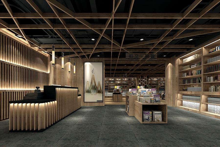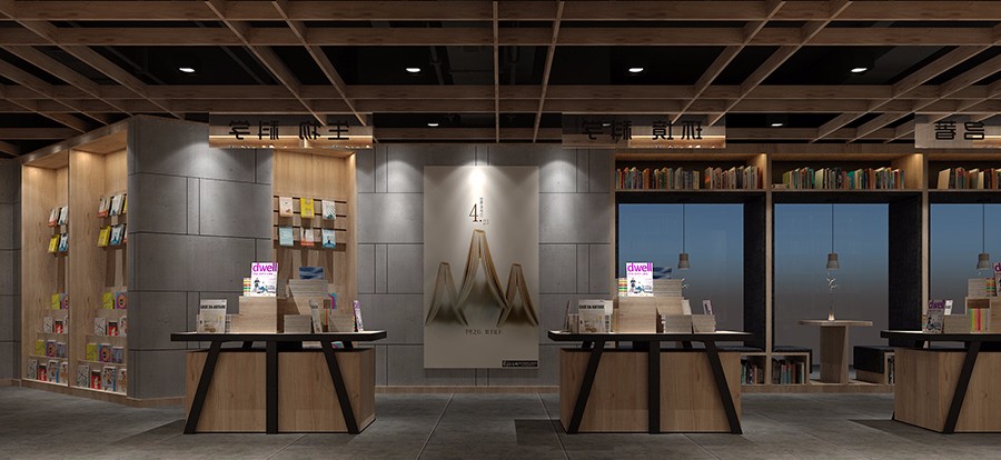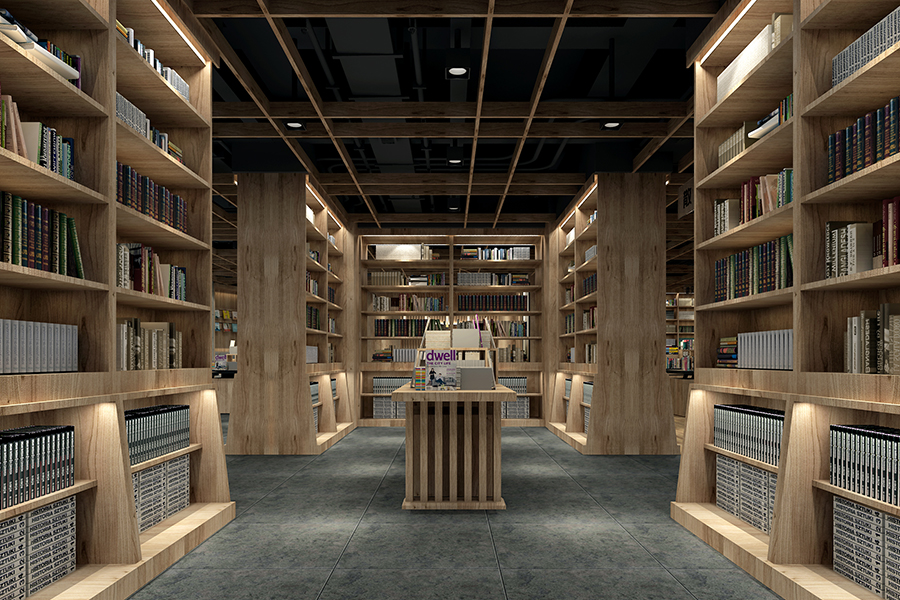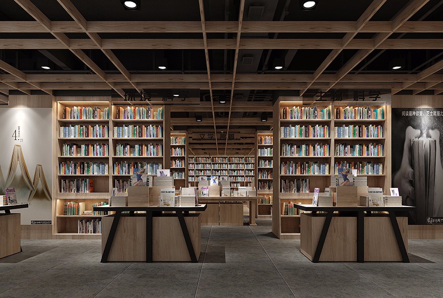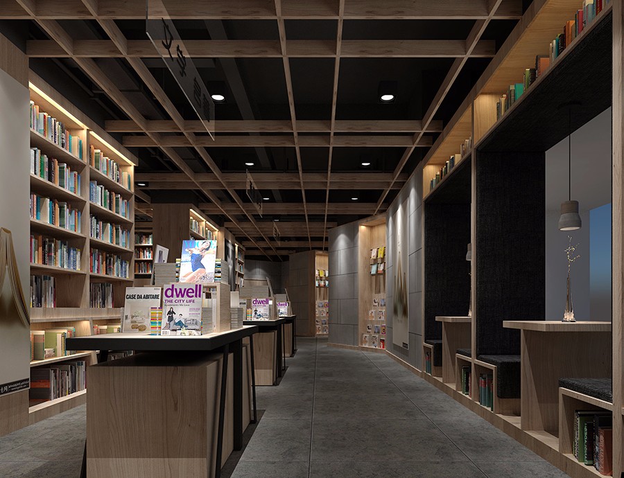 书店运用大量木制书架打造出高低不同、错落有致的空间感。