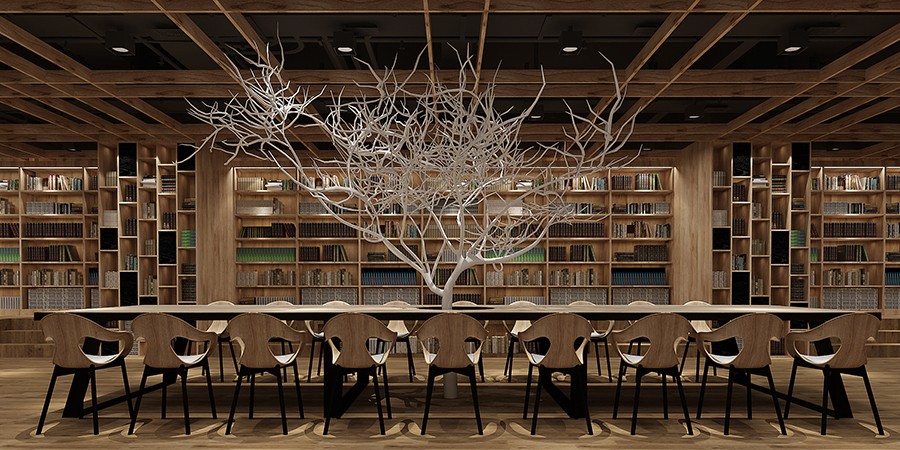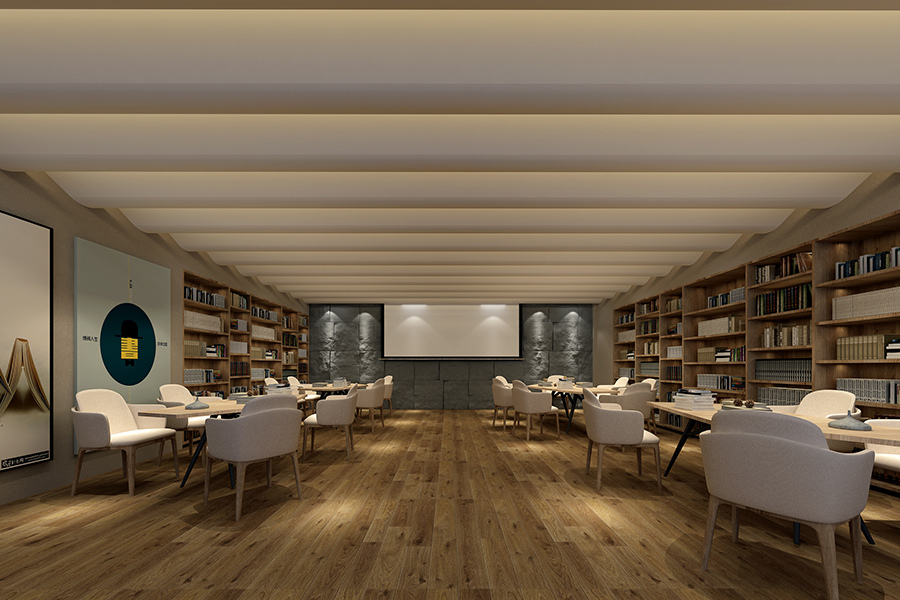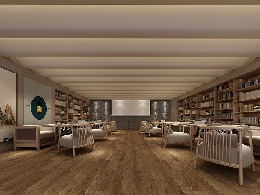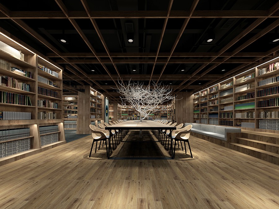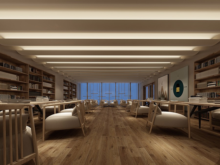 多尺寸的书架围合空间,休闲型的沙发、书桌,搭配柔和的灯光,在这里,可以阅读,可以休憩,也可以低声聊上几句。