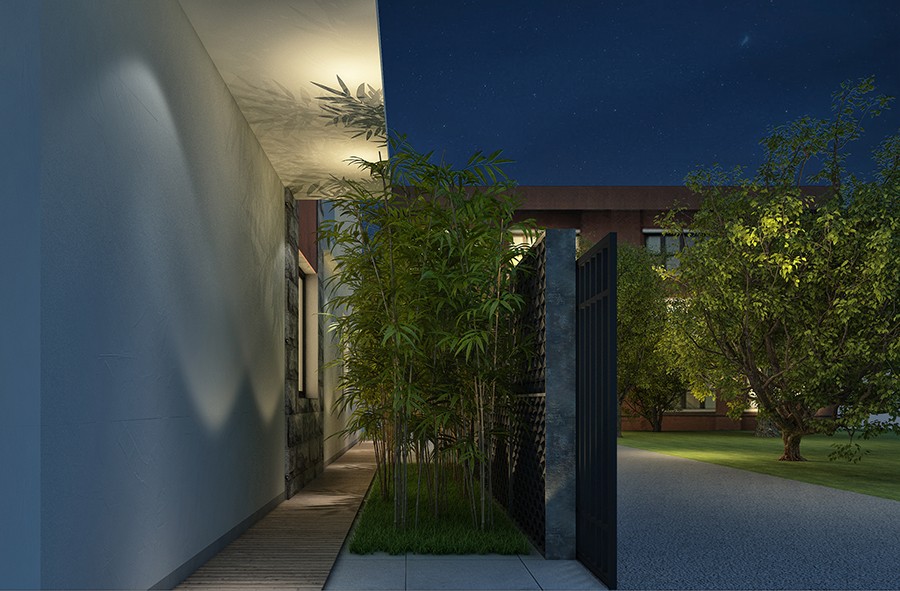 茶室空间利落贯通,视线一览无遗,简明的线条变化为空间营造了流动性的环境氛围。玻璃外景与内部细节映衬,构成一幅天然画作,随日月更迭展现光影变幻之美。