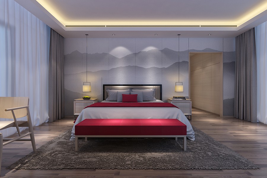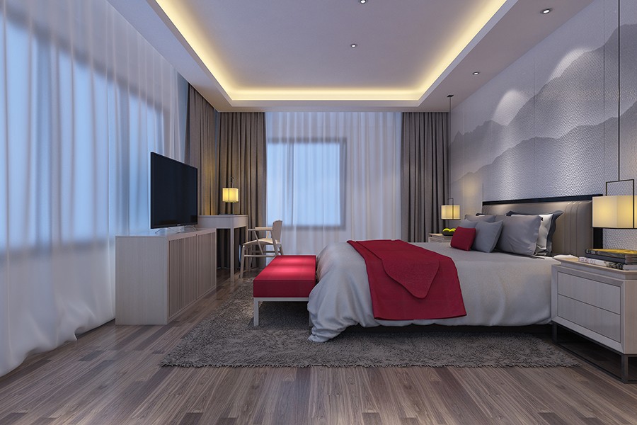 主卧空间,整体流畅而舒适,虚实结合的山水元素巧妙的贯彻整个空间时也赋予空间自然气息.中国红恰到好处的平衡呼应,热情而不张扬.。