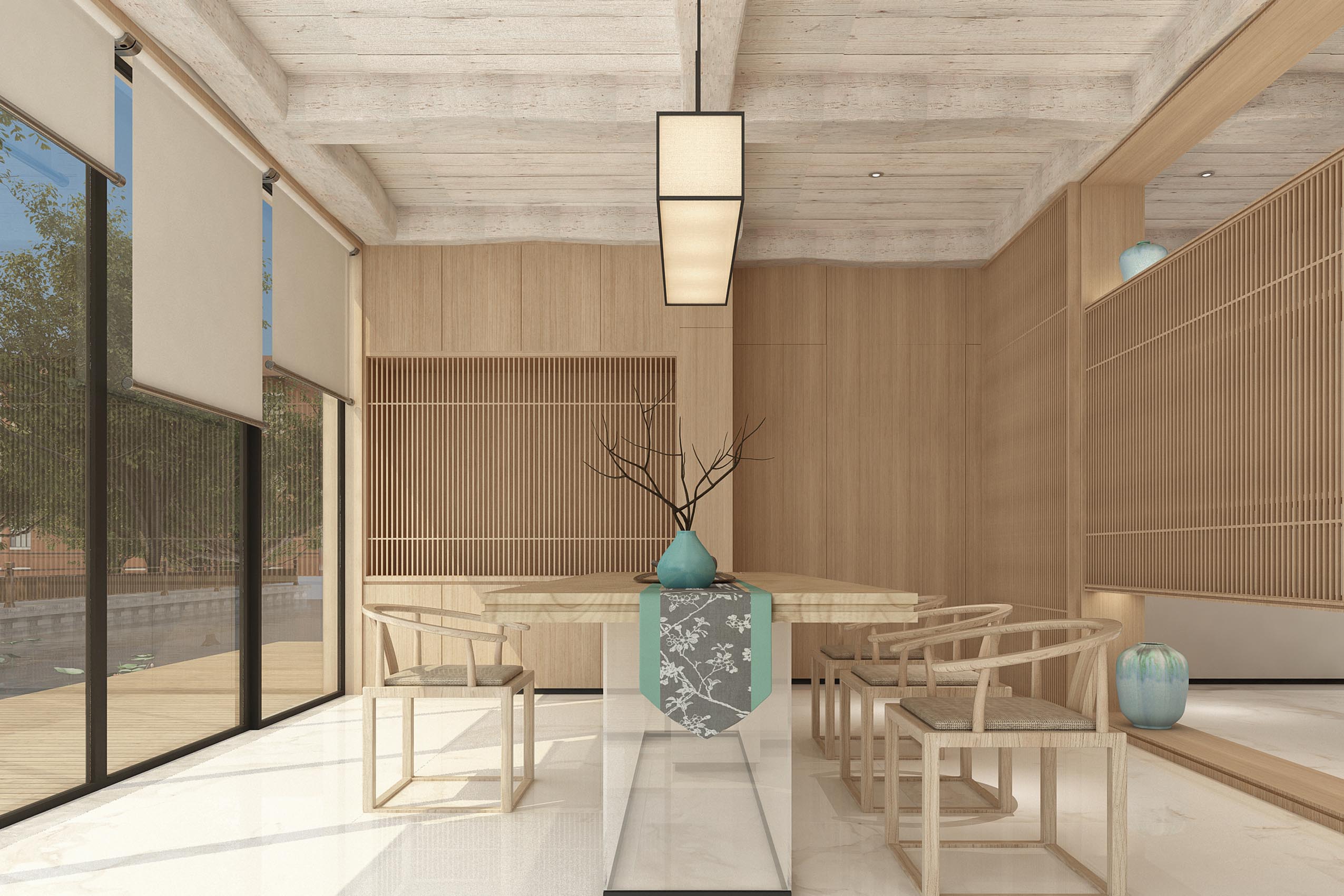 “宁可食无肉不可居无竹”苏氏园林的竹子被我们提取成了格栅,落地的门窗将室外的风景借入室内。