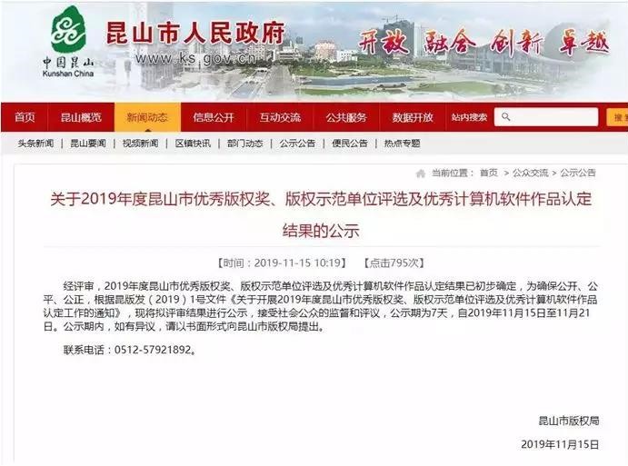 - 2019-11-25 13:32:13 恭喜叙品获评昆山市版权示范单位(附公示文件)
